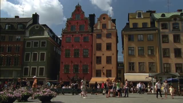 facades of historic buildings in old town in Stockholm - Stortorget - pan