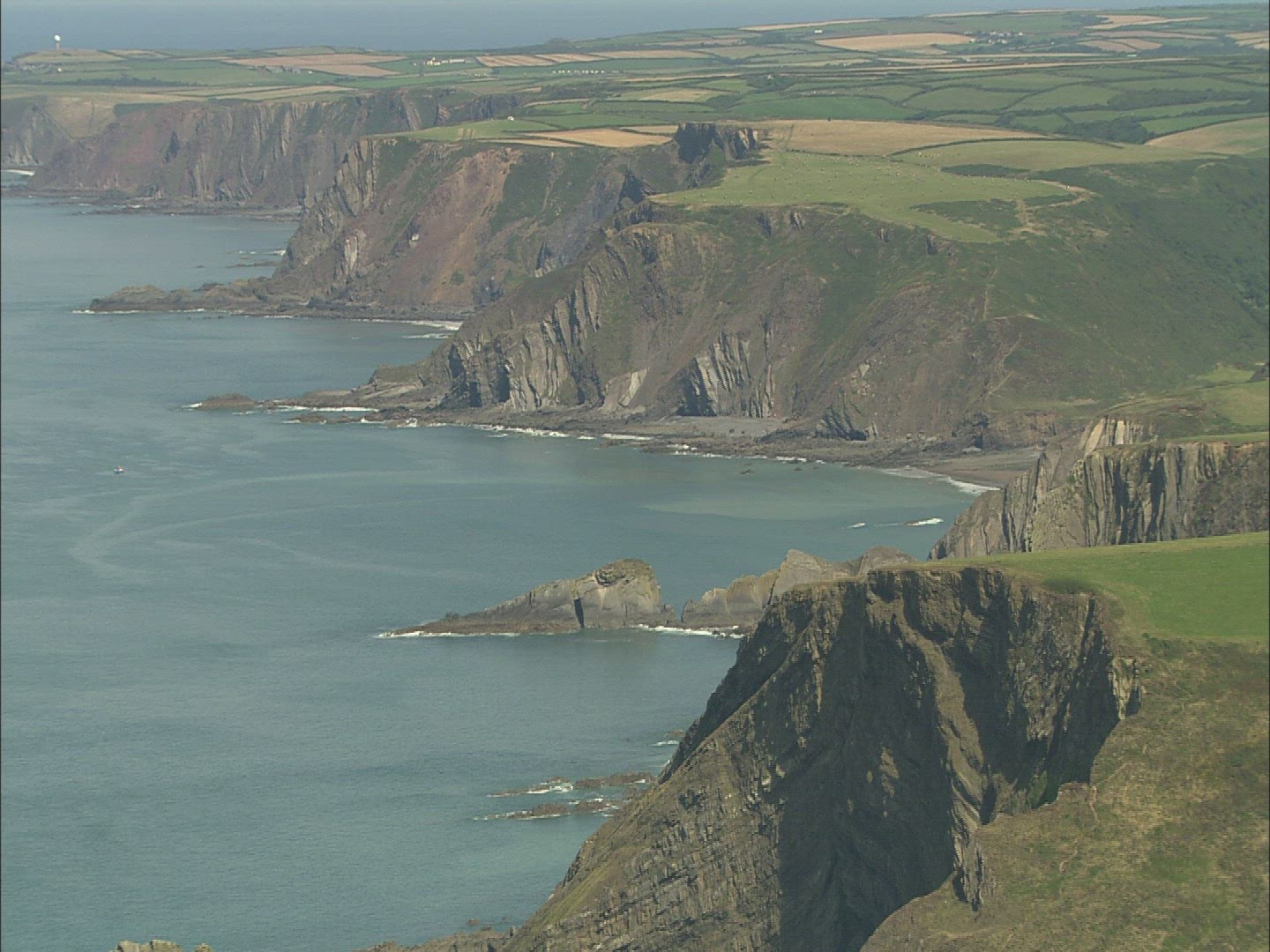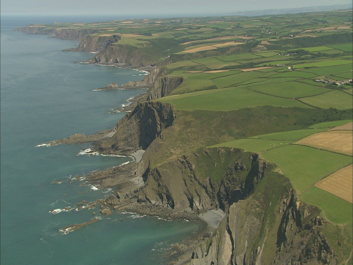 > Aerial view of the White Horse below Bratton Camp, an Iron Age hillfort