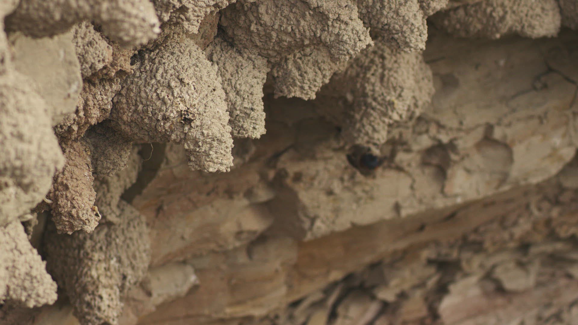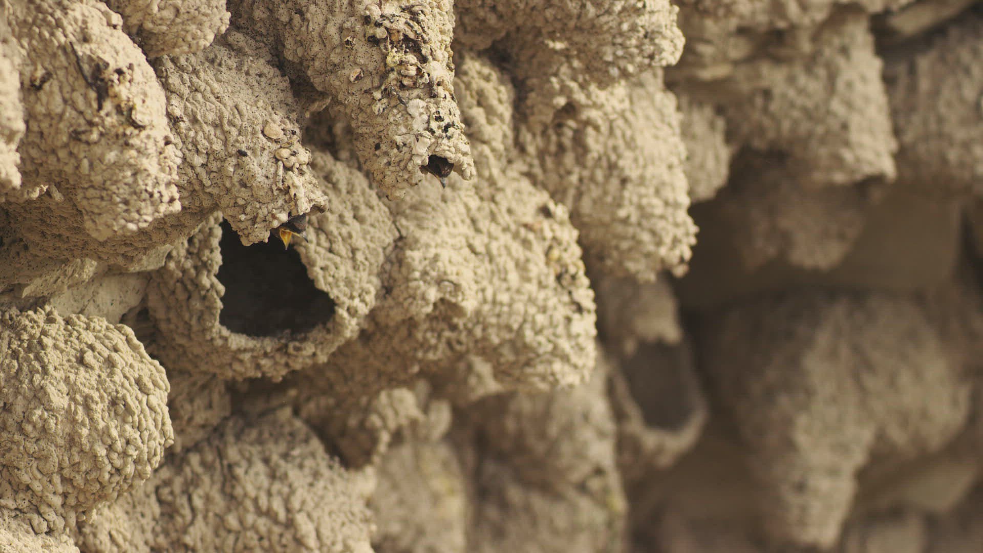 CU SELECTIVE FOCUS Cliff Swallow (Petrochelidon pyrrhonota) building nest; Badlands National Park / South Dakota; USA