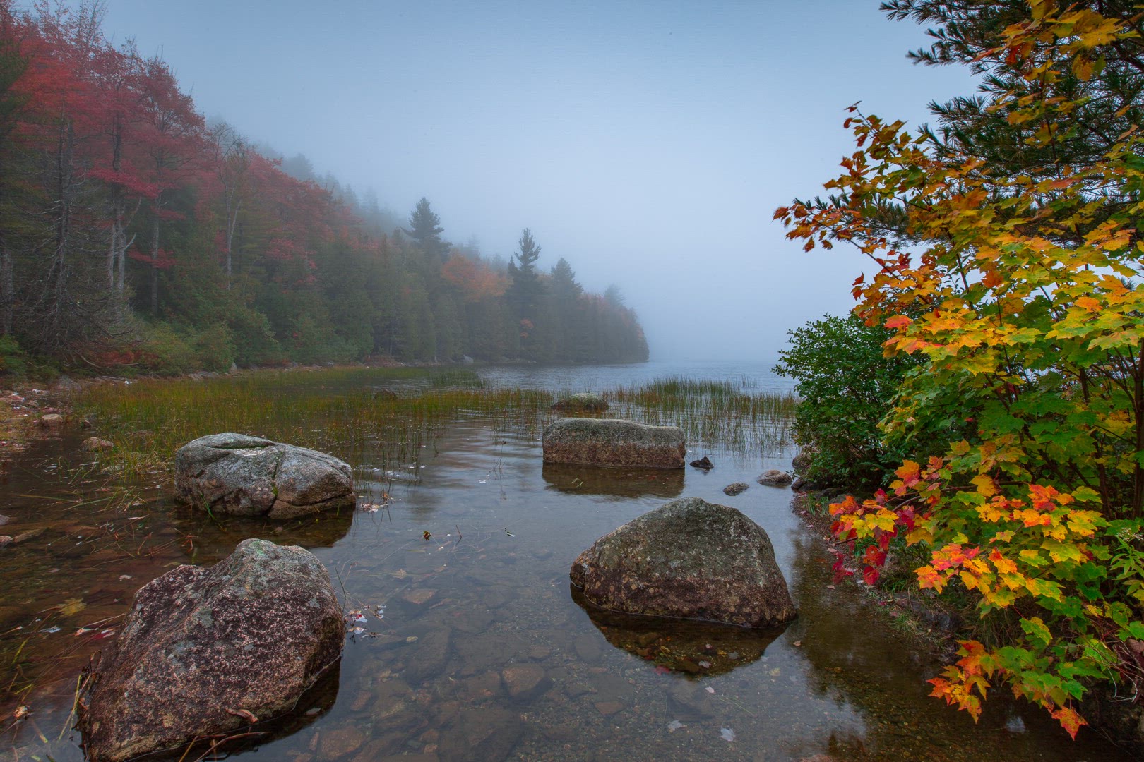 View to Sand beach in Acaddia National Park with rocky coast in foreground