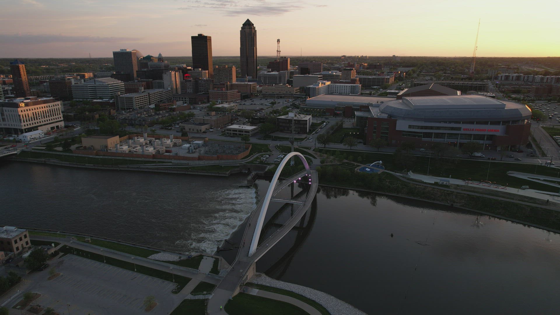 > Drone Aerial Footage of Downtown Des Moines, Iowa.