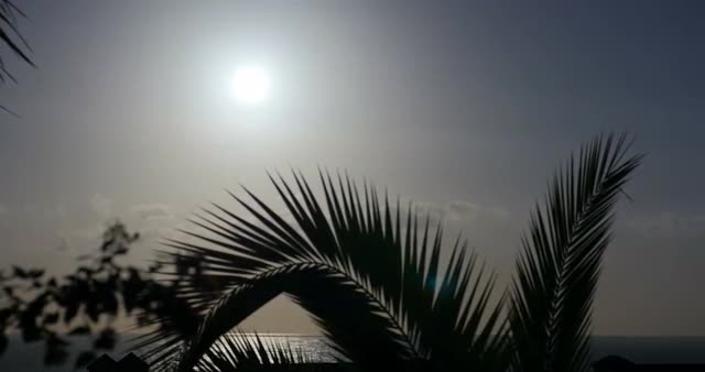 > 4K, Beautiful morning sun with palm(s) in front