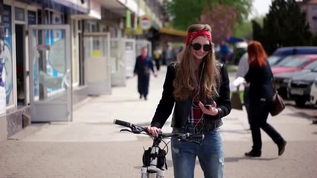742199 - Urban Teenage Casual Hipster Girl on Bicycle With Smartphone and Headphones Listening to Music on Ci