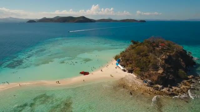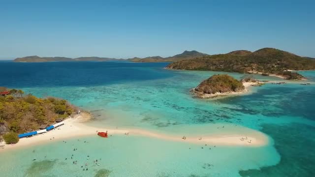 Aerial footage circling around granite boulders on famous Anse Source d'Argent tropical beach at sunny day light during low tide shallow lagoon. La Digue Island, Seychelles.