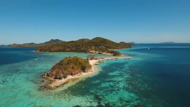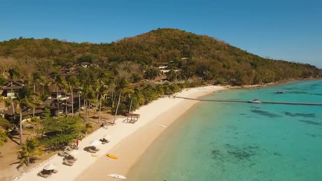 > Aerial footage circling around granite boulders on famous Anse Source d'Argent tropical beach at sun