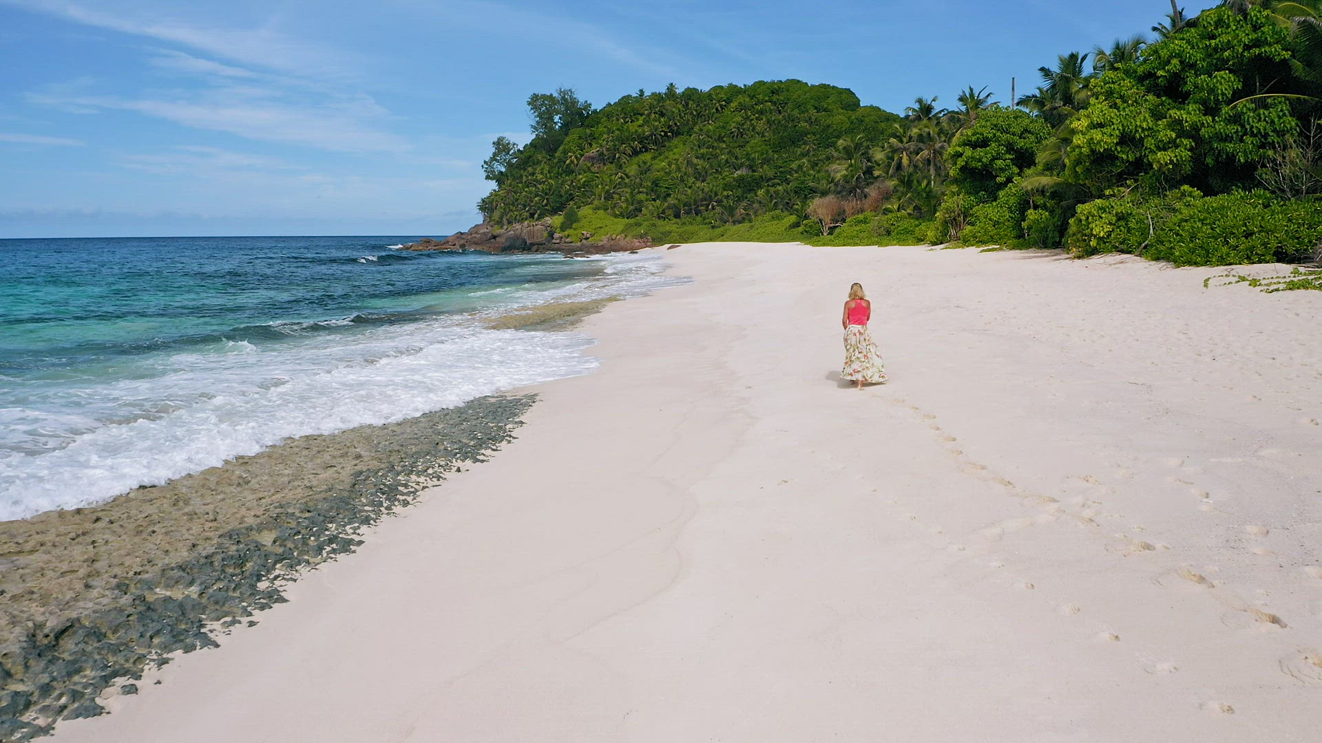Aerial drone footage of tropical paradise beach Anse Coco. Rocky coastline with white sand beach surrounded by rainforest. La Digue island, Seychelles.