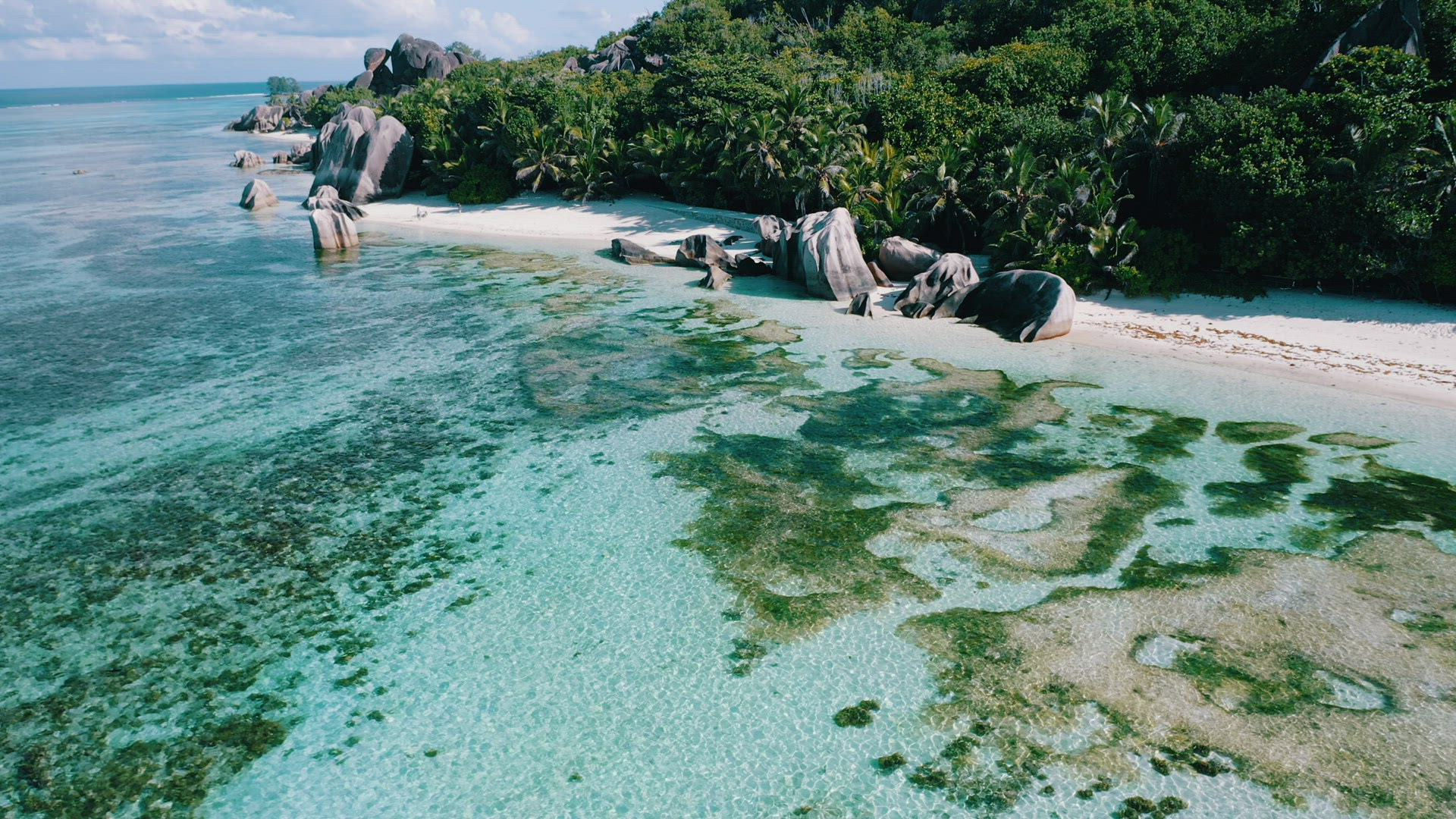 Aerial drone 4k side flight above Anse Source D'argent beach on La Digue island, Seychelles. Morning