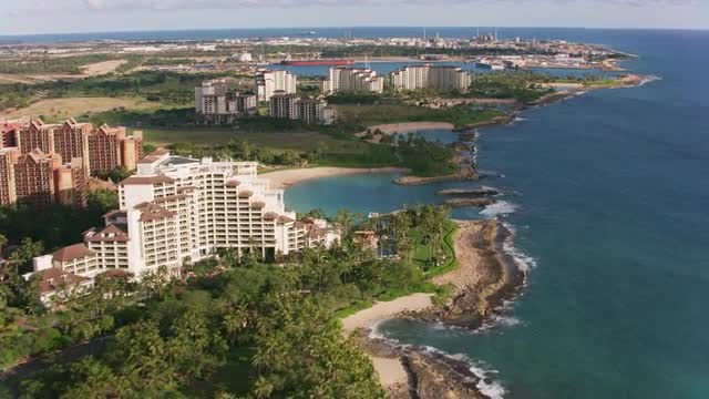 Aerial footage of unique huge granite boulders ridge made by nature and surrounded by paradise white sand beaches with crystal clear turquoise blue ocean water. La Digue island, Seychelles.