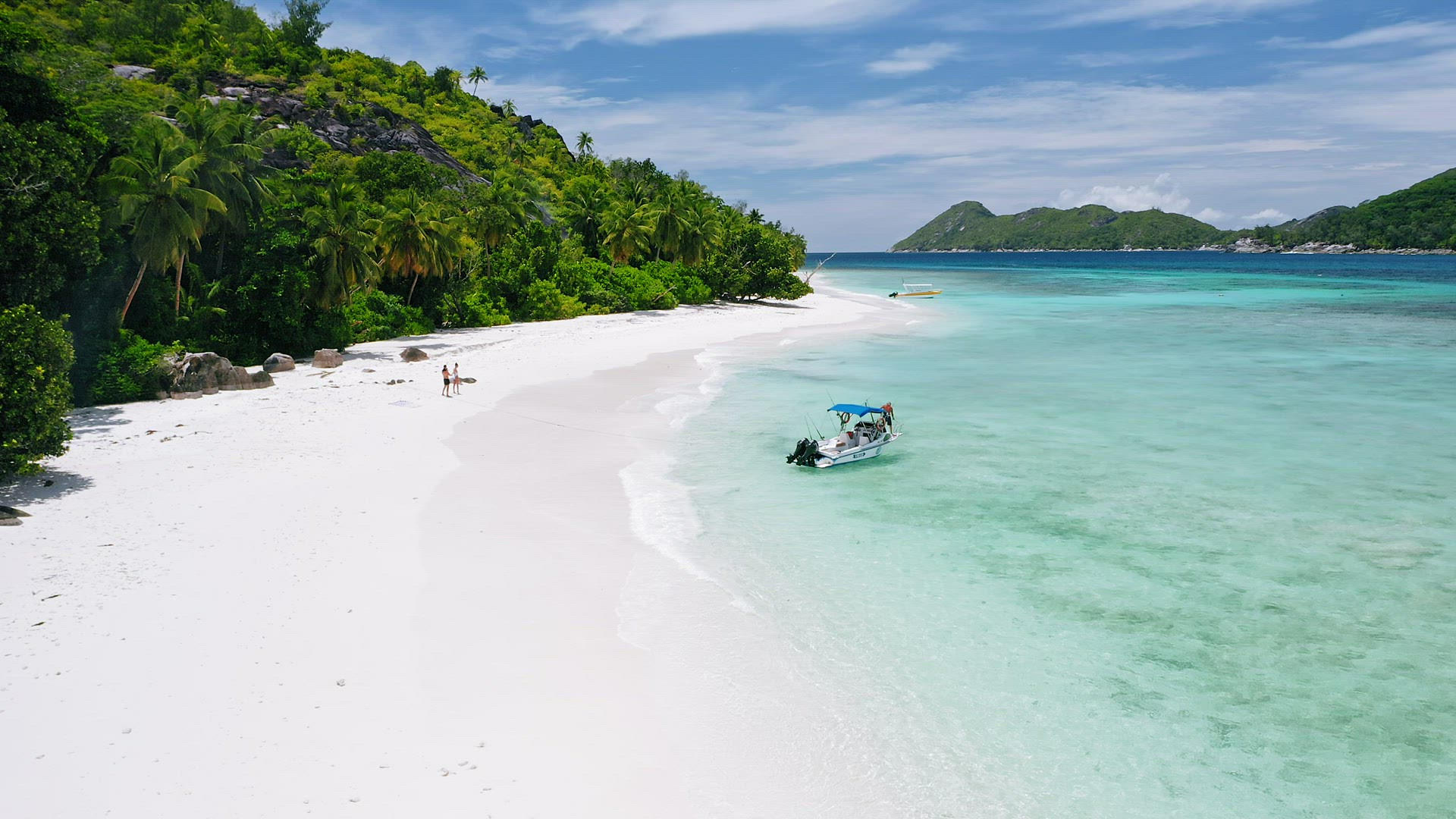> Aerial footage of famous granite boulders on Anse Source d'Argent tropical beach at sunny day bright