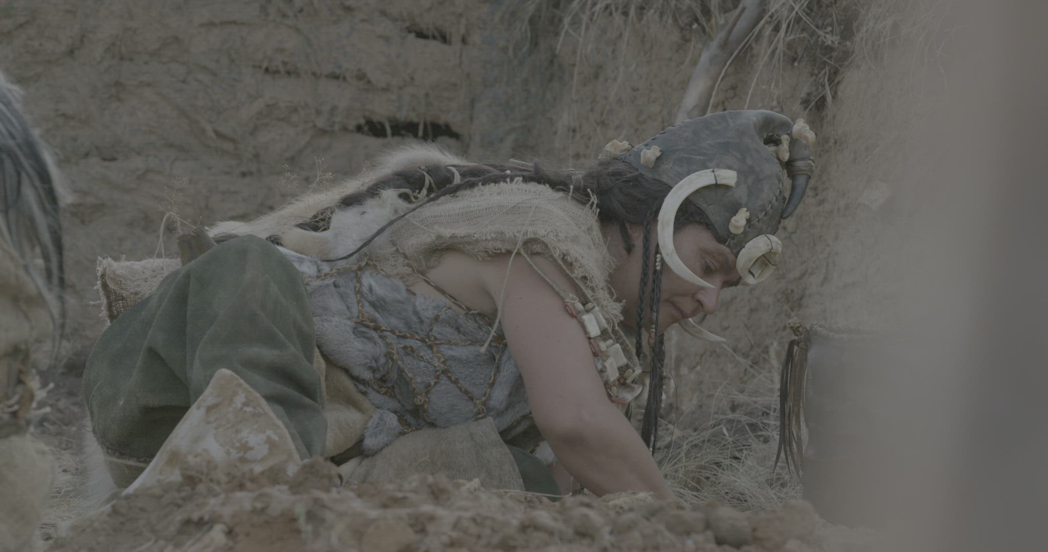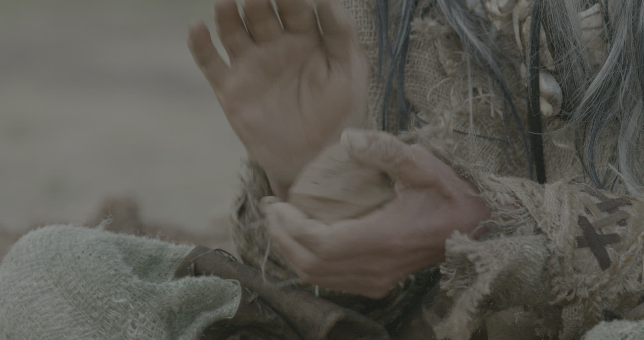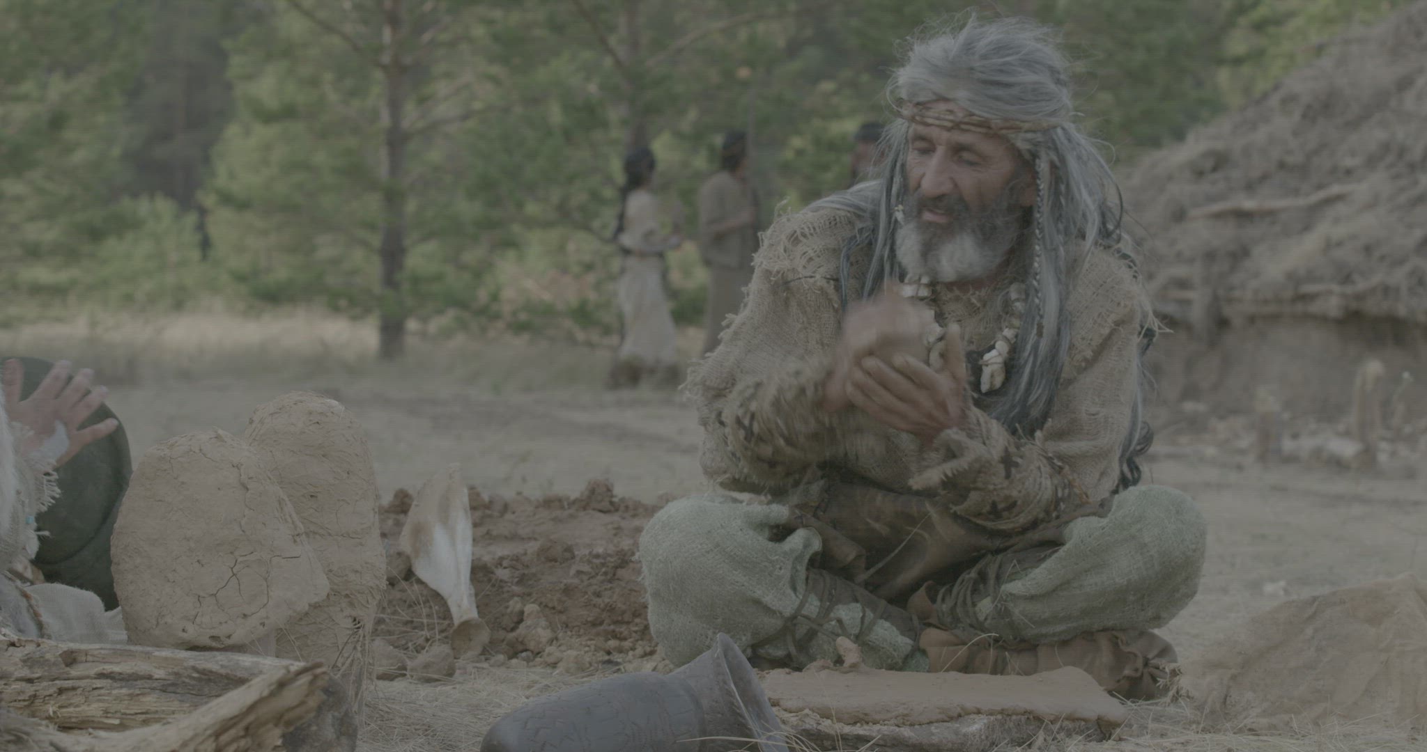 man preparing clay ball and compressing it between his hands while sitting with woman and child on the ground