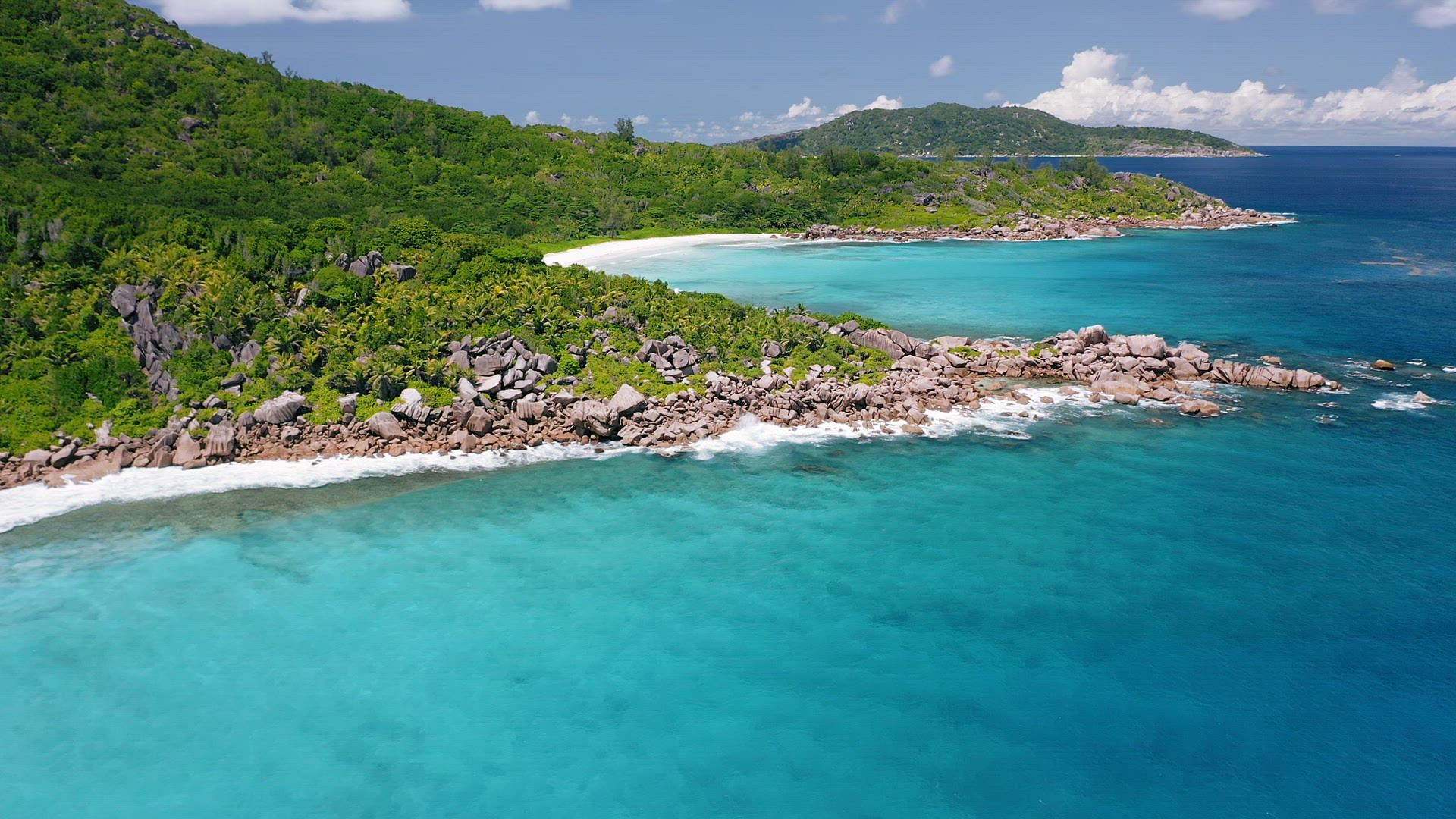 Aerial hover down footage of well known Anse Source d'Argent tropical beach at sunny day bright ligh