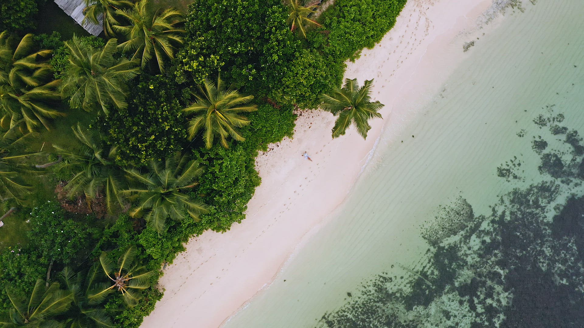 4k aerial view vertical spinning move up footage from girl sitting on a white sand beach. Surrounded by crystal clear turquoise shallow ocean and pam trees on tropical island.