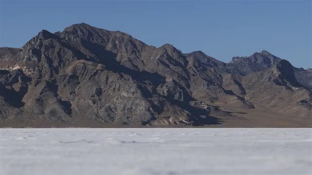 345951 - Flying forward from the gravel edge of rest stop out over the salt flats with mountains in the backg