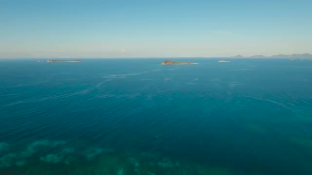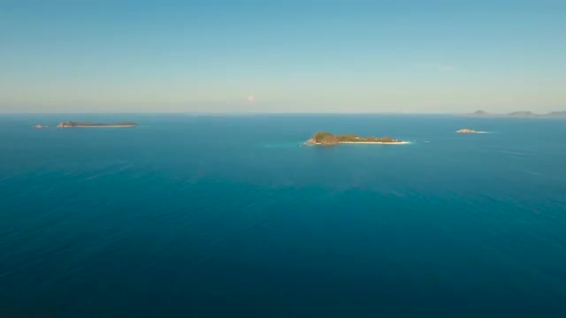Mahe, Theresa Island. Seychelles. Aerial view of tropical exotic blue lagoon with clear blue ocean water and lush green palm coconut trees on shore.
