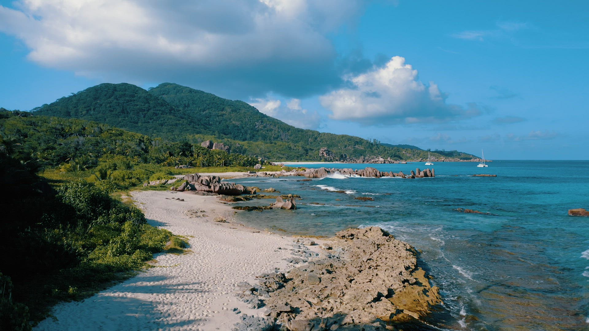 Aerial approaching view of lonely tourist boat moored in tropical exotic blue lagoon with clear blue ocean water. Lush green palm coconut trees on the beach