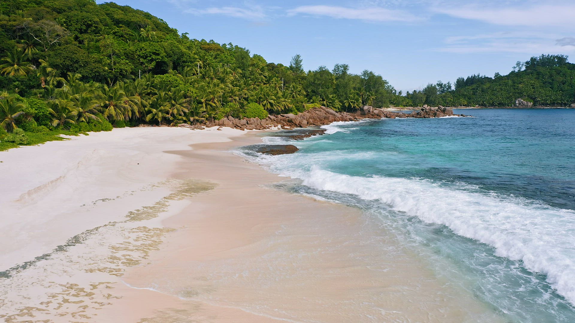 Aerial 4K drone footage of tropical beach and white ocean waves at Mahe island, Seychelles