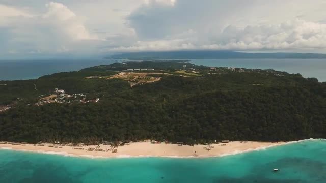 Seychelles. Aerial view of ocean waves rolling to white sand tropical deserted beach.