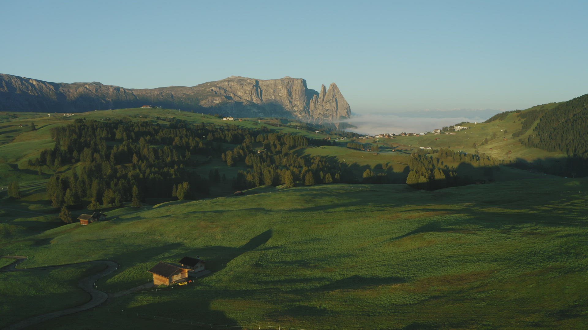 > Alpe di Suisi, Dolomites, Italy Aerial drone view of Alpine meadow at idyllic Seiser Alm valley with