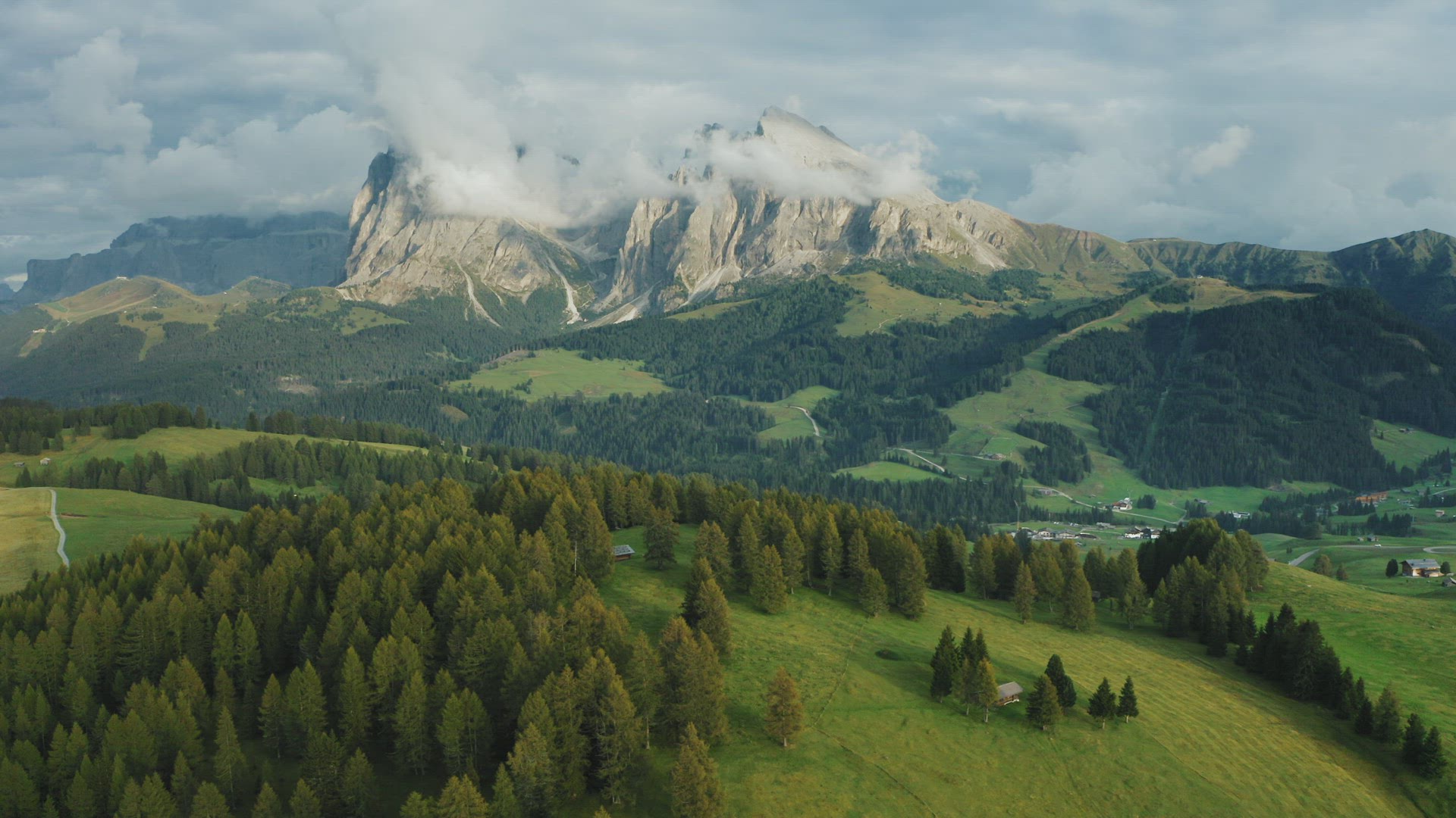 Alpe di Suisi, Dolomites, Italy Aerial drone view of Alpine meadow at idyllic Seiser Alm valley with mountains in background in South Tyrol. Europe.