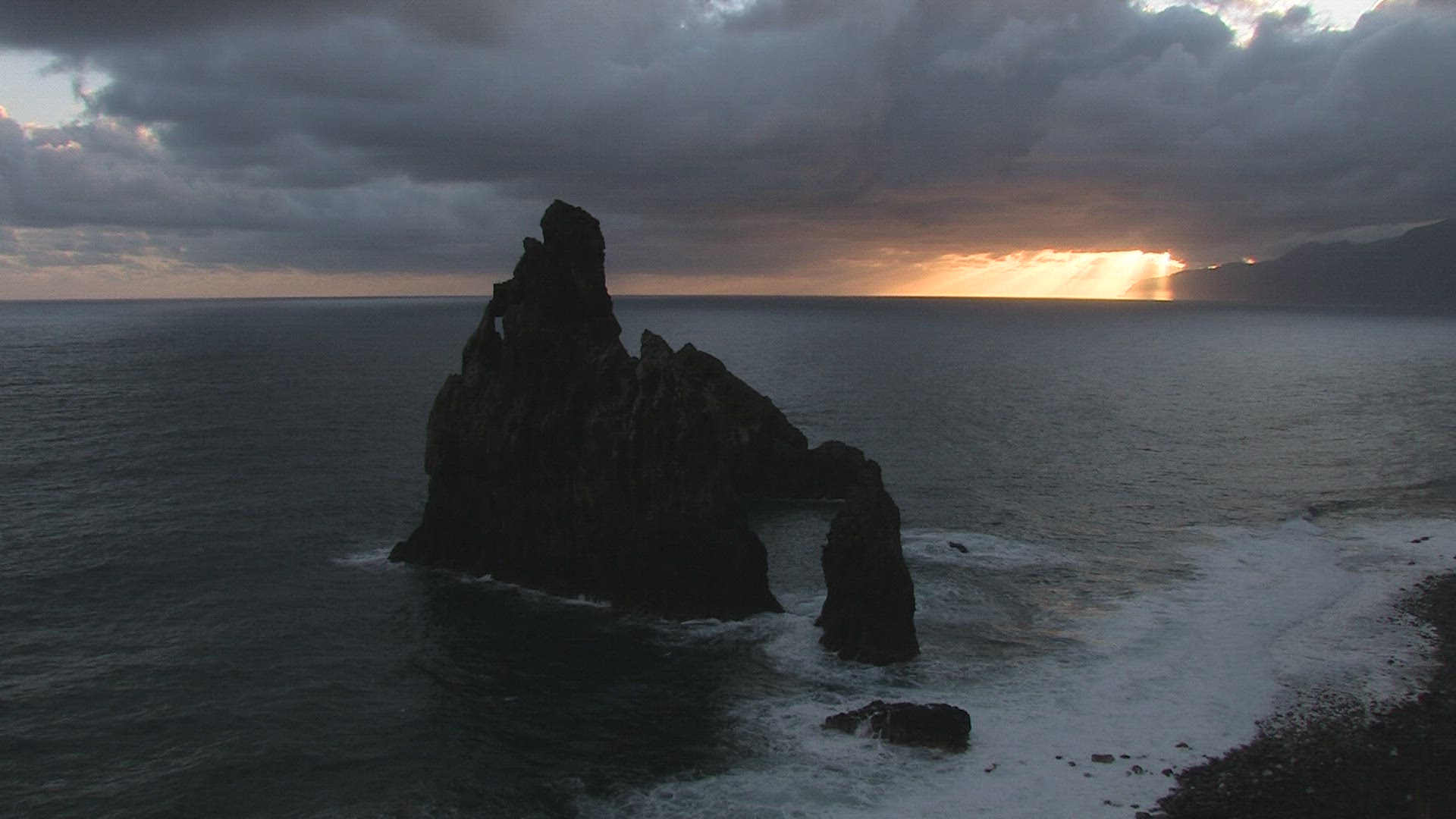 > 4K Aerial view of Atlantic ocean waves and rocky cost cliffs of Praia Grande beach, Portugal