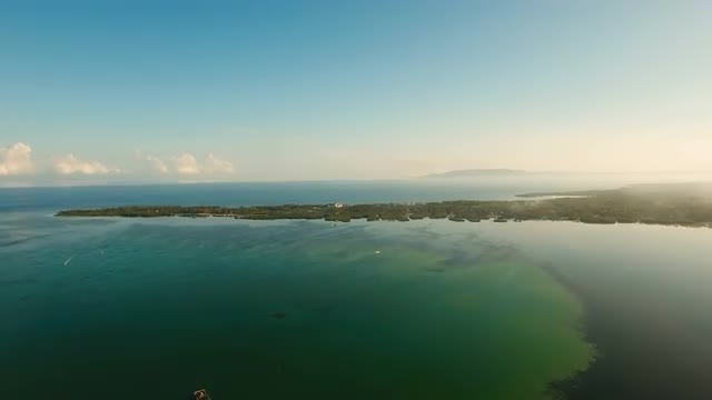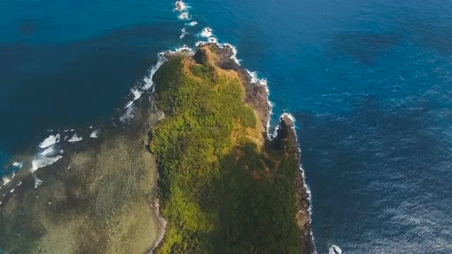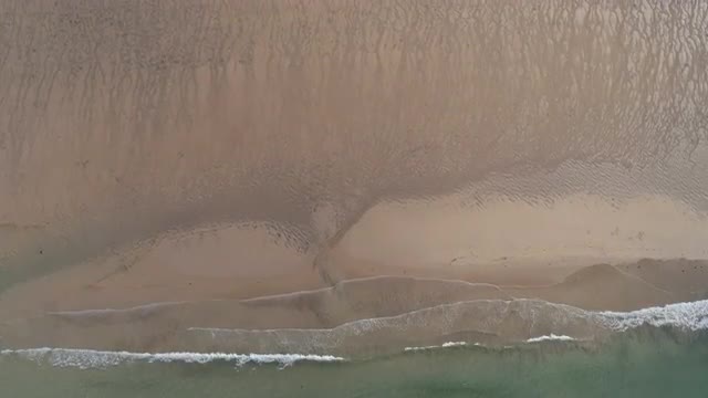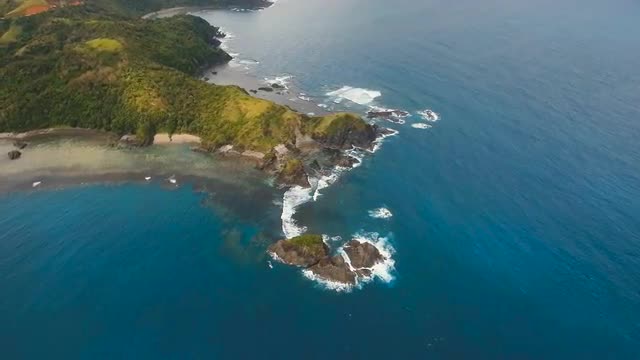 Top aerial view of waves break on tropical yellow sand beach. Bird's eye perspective of emerald gree