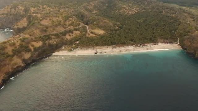 > Aerial bird eye view of surreal Praia da Adraga beach in Sintra, Portugal. White waves rolling towar