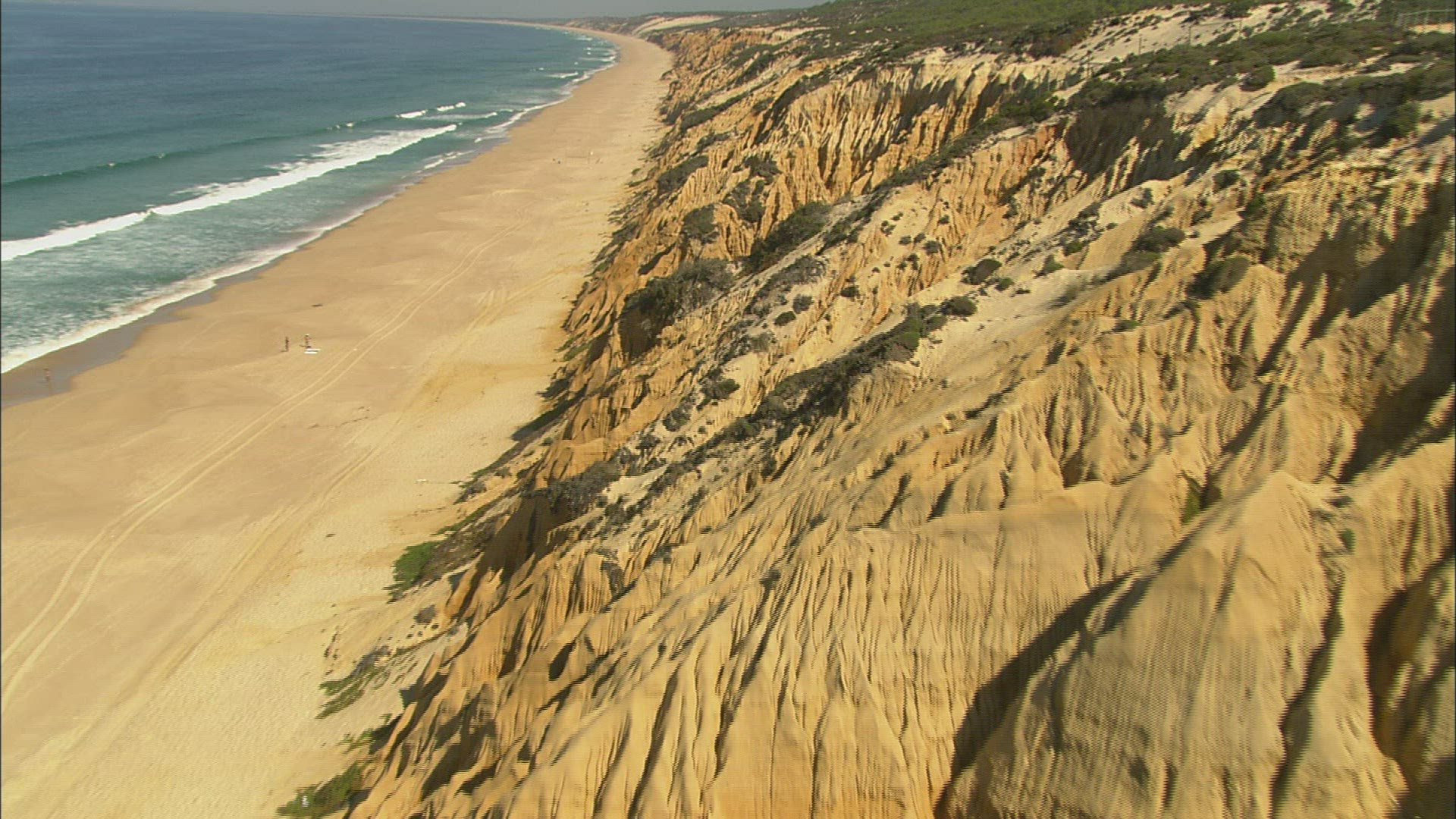 Aerial circle fly around rocky cliffs of Praia da Ursa beach located on Atlantic coast in Sintra, Portugal. Europe.