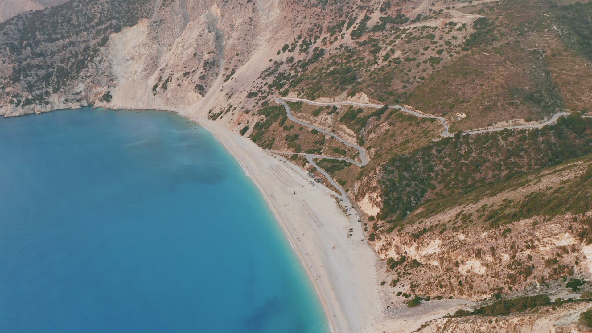 Aerial view of Myrtos beach at sunset, the most beautiful beach of Kefalonia, Greece.