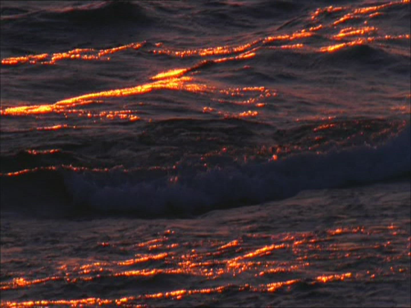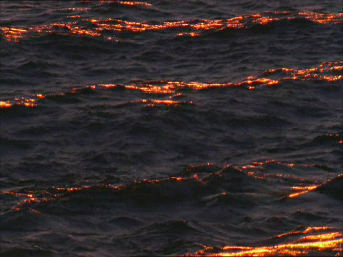 Aerial flying over sea water surface with calm waves at sunset evening glowing orange sky.