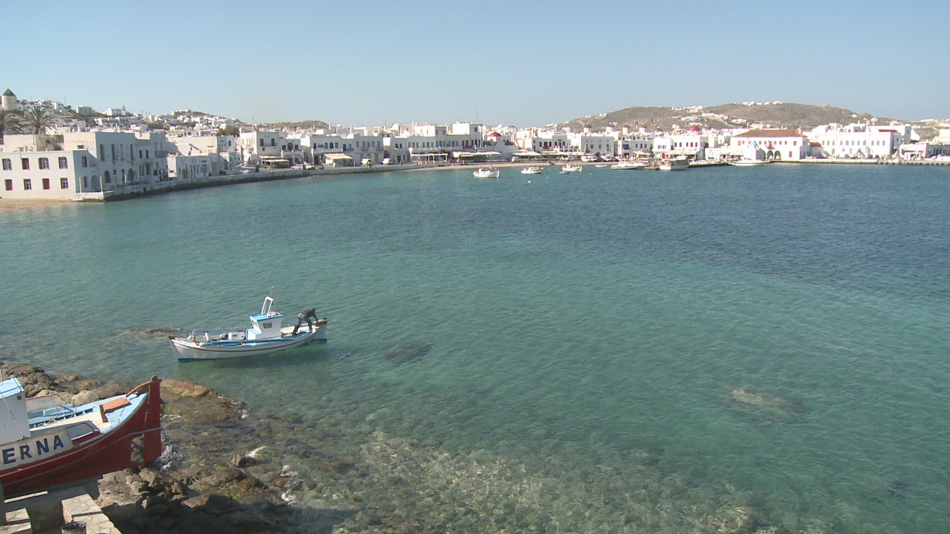 > Aerial calm fly near beautiful Milos beach of Lefkada, Ionian island, Greece. Sunset golden sunlight