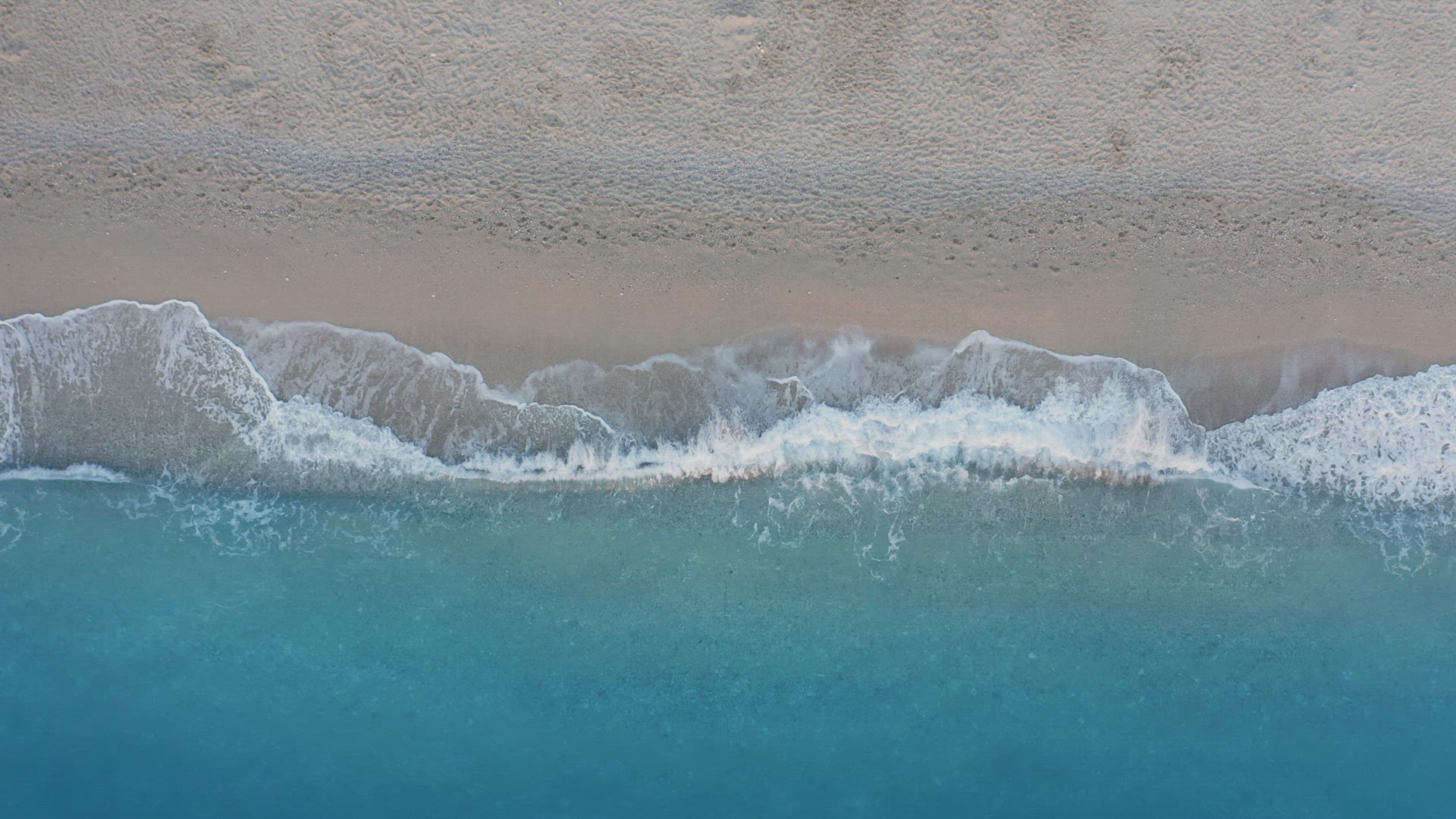 > Top down view of sandy beach and turquoise sea waves at shore edge. Summer vacation travel scene.