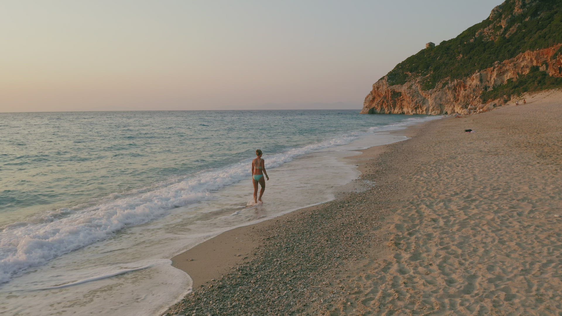 Aerial low altitude follow view of adult woman enjoying beautiful Milos beach of Lefkada, Ionian island, Greece. Sunset golden sunlight and pristine waves breaking the turquoise blue sea on the shore