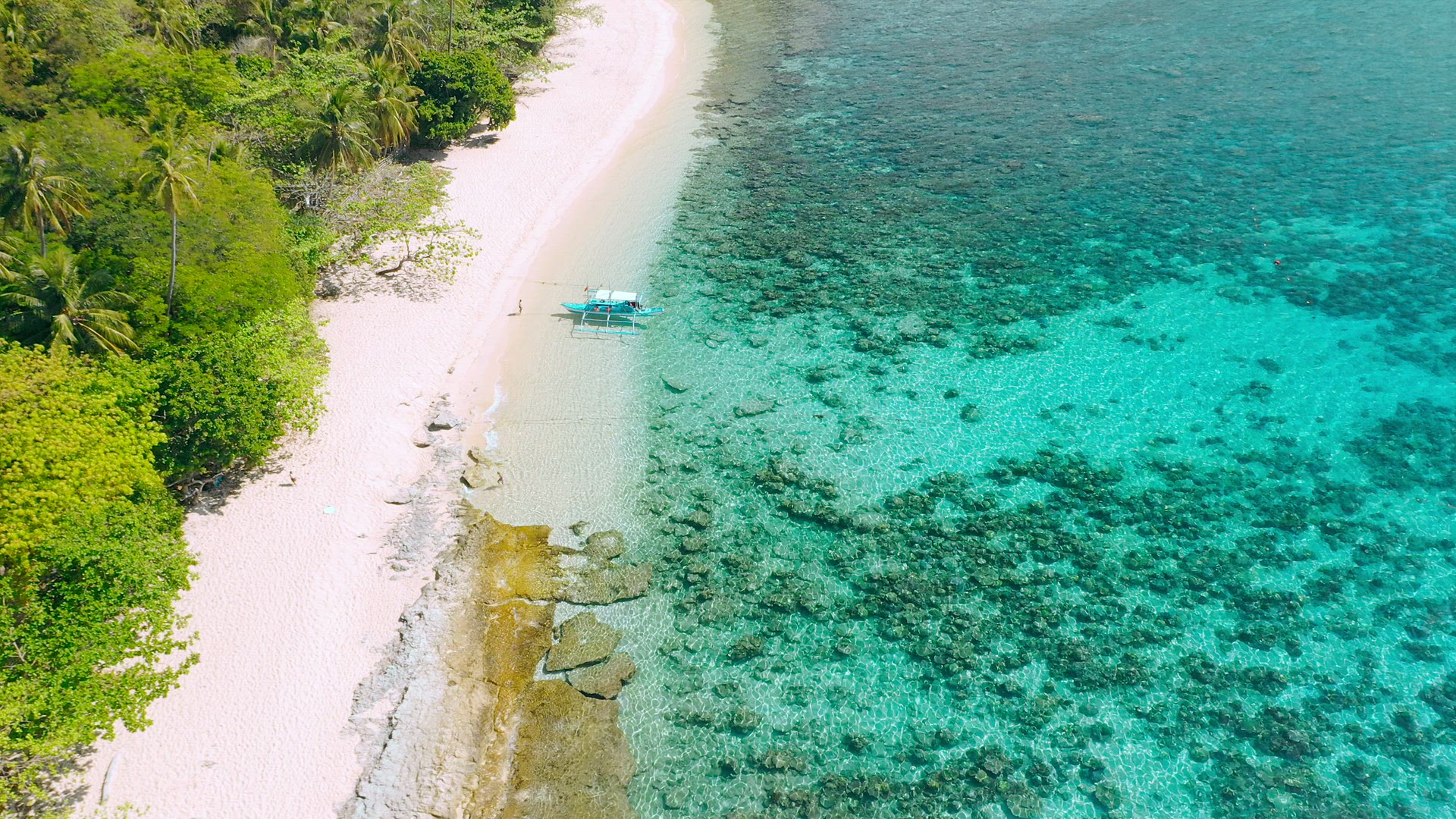 > Helicopter Island, Philippines. Aerial drone view of a exotic island with white sand beach, green ju
