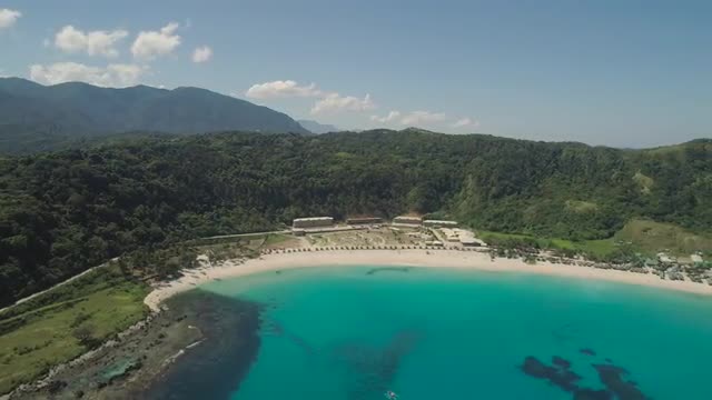 > Aerial footage of tropical beach on Helicopter island with palm trees, blue lagoon, azure clear wate