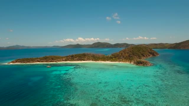 Aerial view of big and small lagoon on Miniloc Island. El-Nido, Palawan. Philippines. Limestone rock formation covered with plants surrounded by blue blue. Tour A.