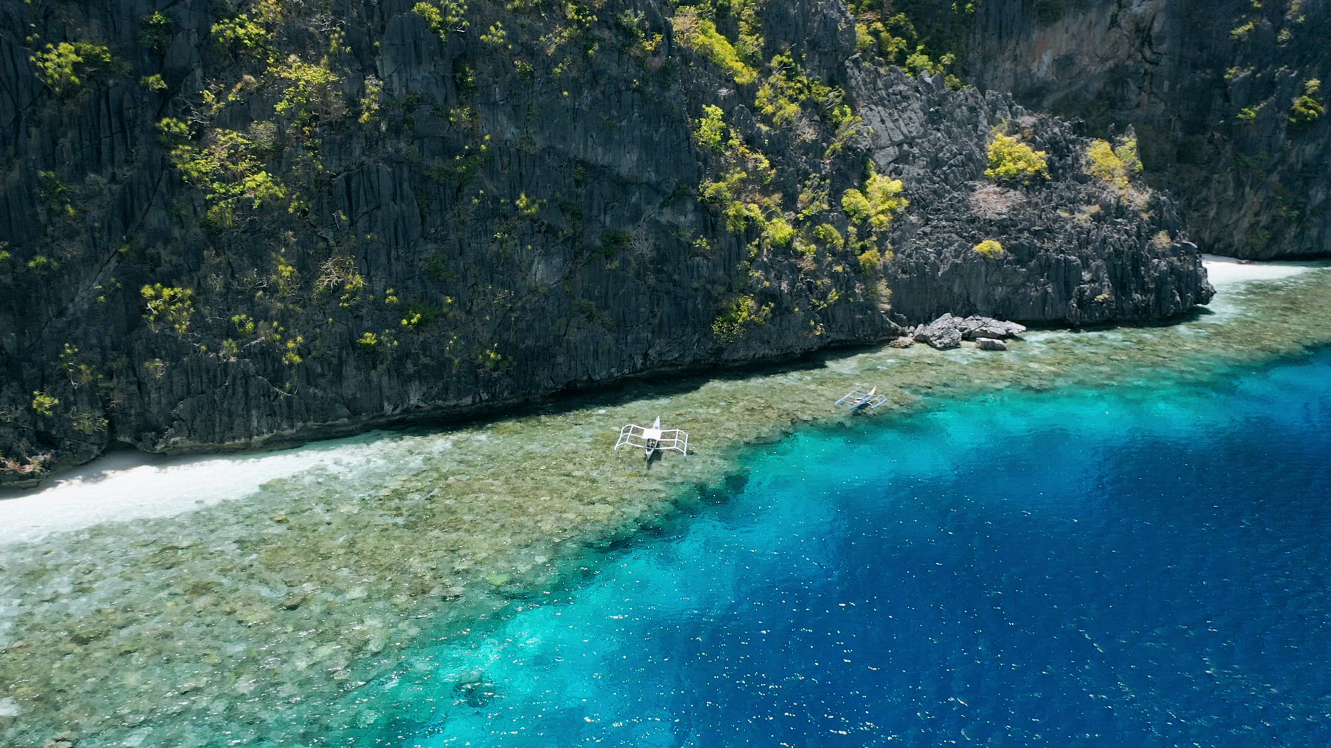 Circle aerial footage of trip banca tourist boats resting over coral reef near Matinlok shrine. El Nido, Palawan Philippines.