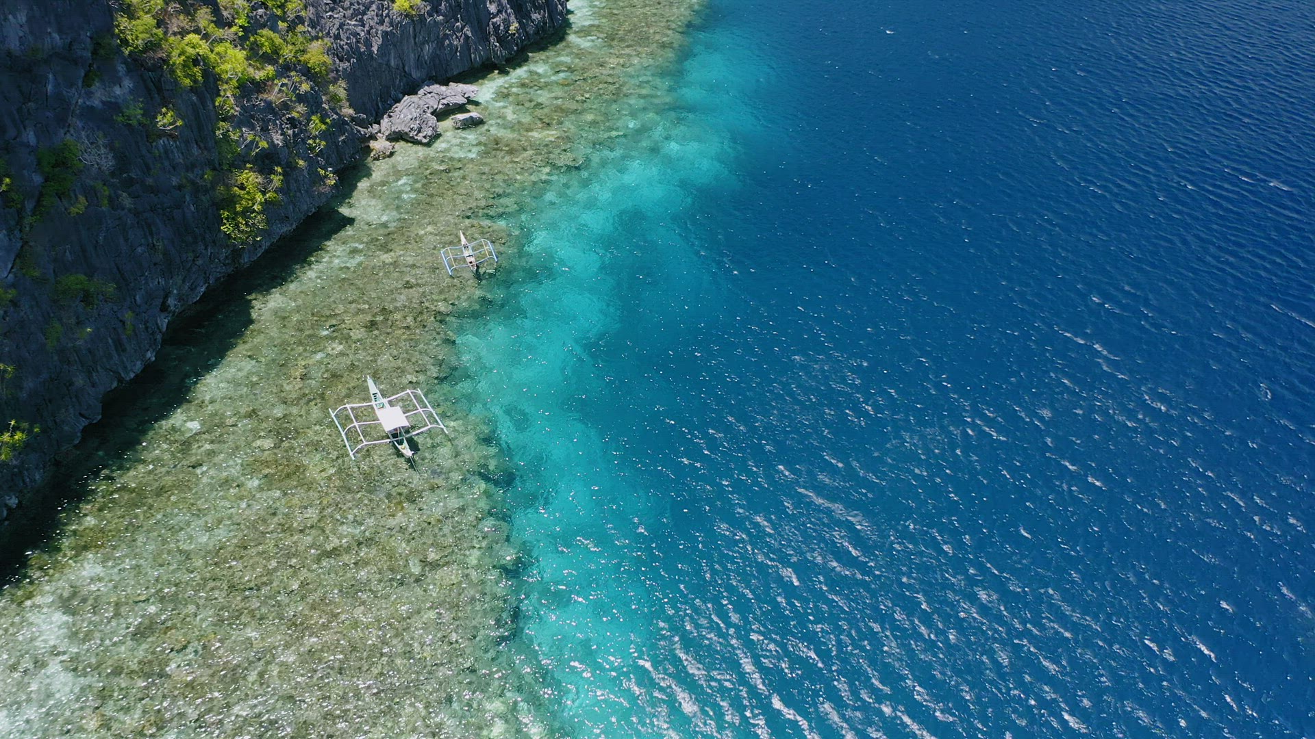 > Circle aerial footage of trip banca tourist boats resting over coral reef near Matinlok shrine. El N