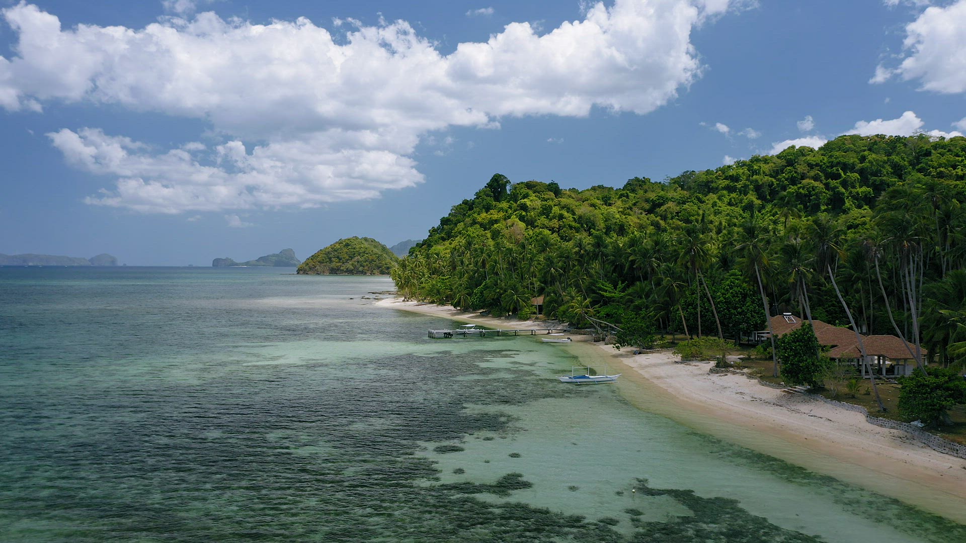 Aerial drone - tourist banca boat moored at sandbar during low tide. Surrounded islands and white clouds moving n background. El Nido, Palawan, Philippines.