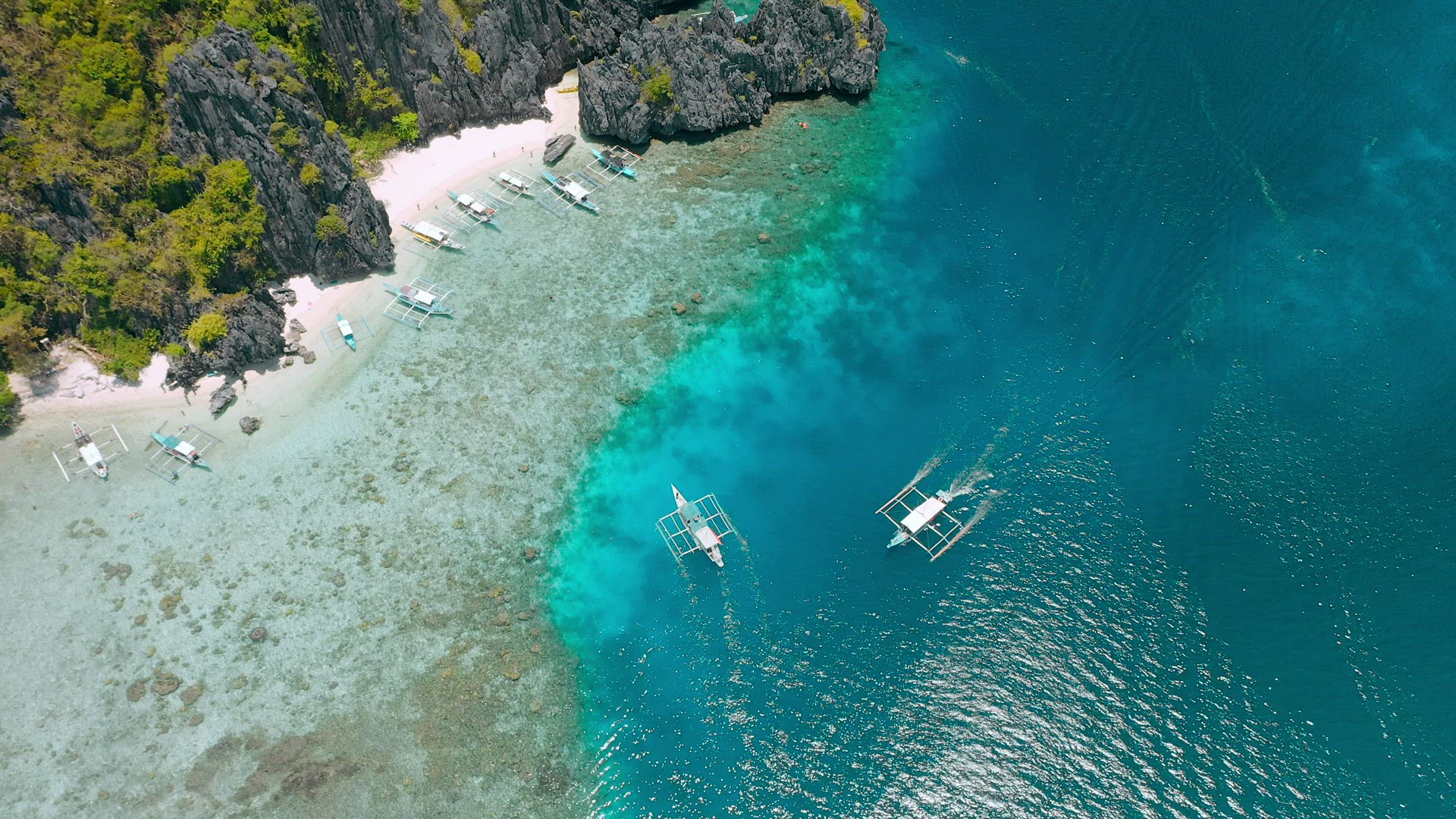 > El Nido, Palawan island, Philippines. Aerial drone view of boat moving in open sea with beautiful is