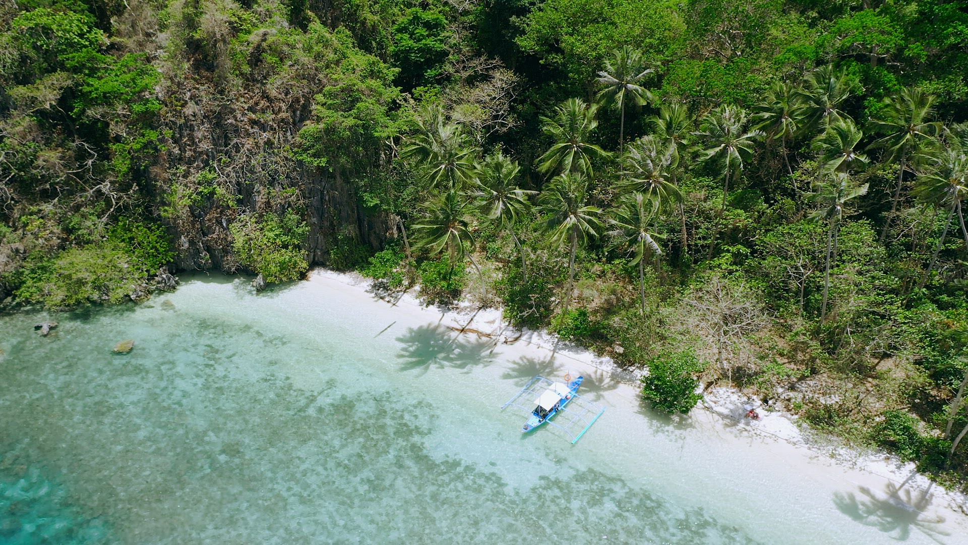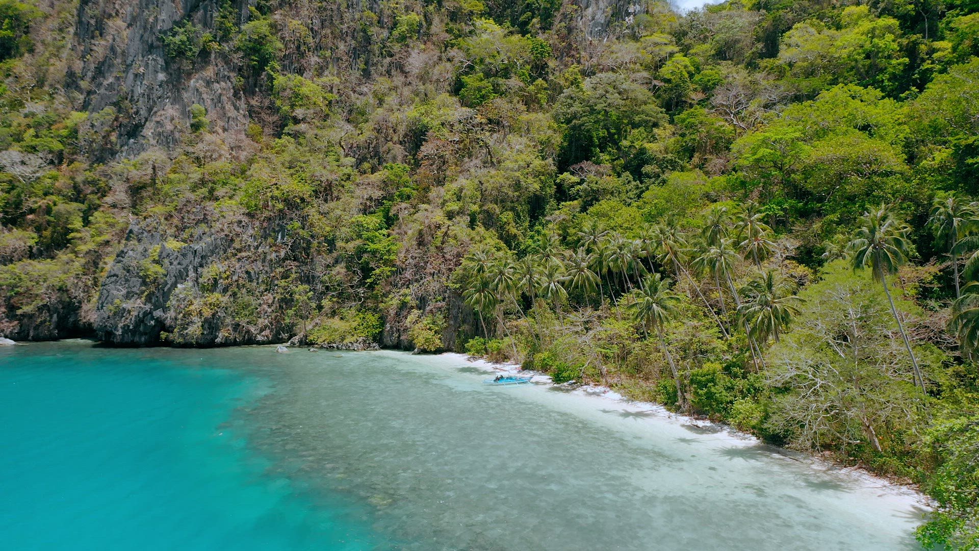 Aerial view of cure small tropical Ipil beach. Pinagbuyutan Island, El Nido, Palawan, Philippines. Crystal clear turquoise blue water, sandy beach, palm trees and intact coral reef.