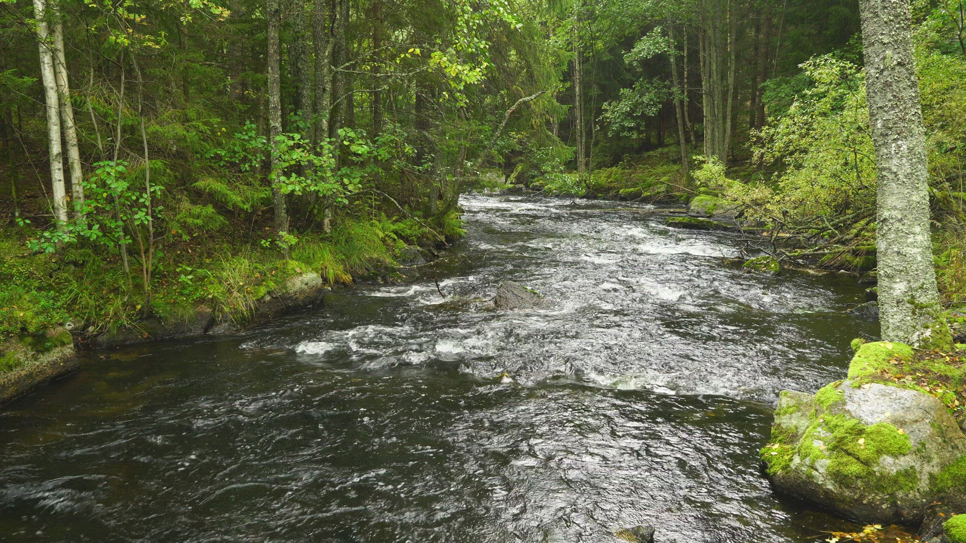 > river in swedish forest - rainy weather - pan