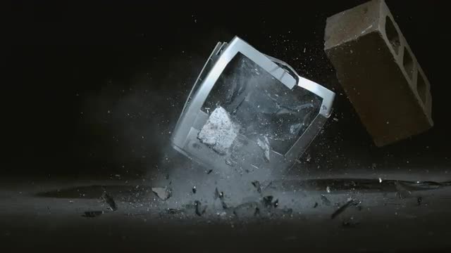 380105 - Concrete block is dropped on television in slow motion; shot on Phantom Flex 4K at 1000 fps