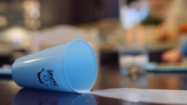 1094338 - Toddler accidentally spills cup of milk on the table and mother wipes it up