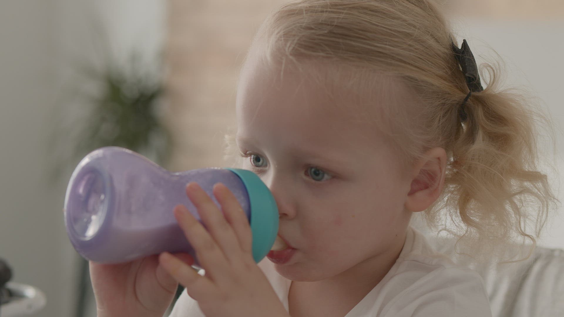 Cute toddler girl drinking a glass of milk. 4K footage.