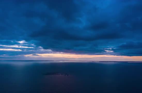Aerial of salmon farming net cages on the sea with the background of green hills in Patagonia, Chile