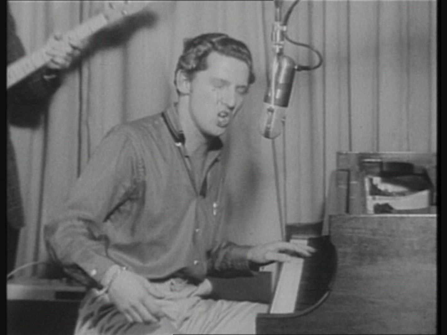 Jerry Lee Lewis interviewed, Lewis sings part of "Great Balls of Fire." Lewis at press conference with young wife, Myra Gale Brown. Newspaper headline reads: LEE'S MARRIAGE TO 13 YEAR OLD SHOCKS BRITAIN, IRATE FANS WREAK HAVOC AT JERRY LEE LEWIS CONCERT, POLICE CHECK UP ON CHILD BRIDE. Interviewer asks Lewis about wedding.