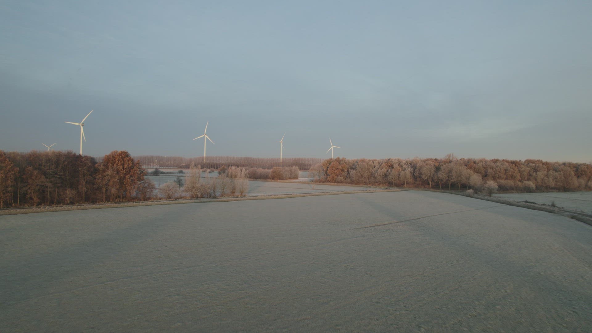 AERIAL WS Frozen polder landscape with wind turbines / Netherlands