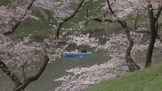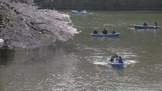 575731 - Visitors on rental boats enjoying blooming cherry blossoms fluttering in the wind at Chidorigafuchi