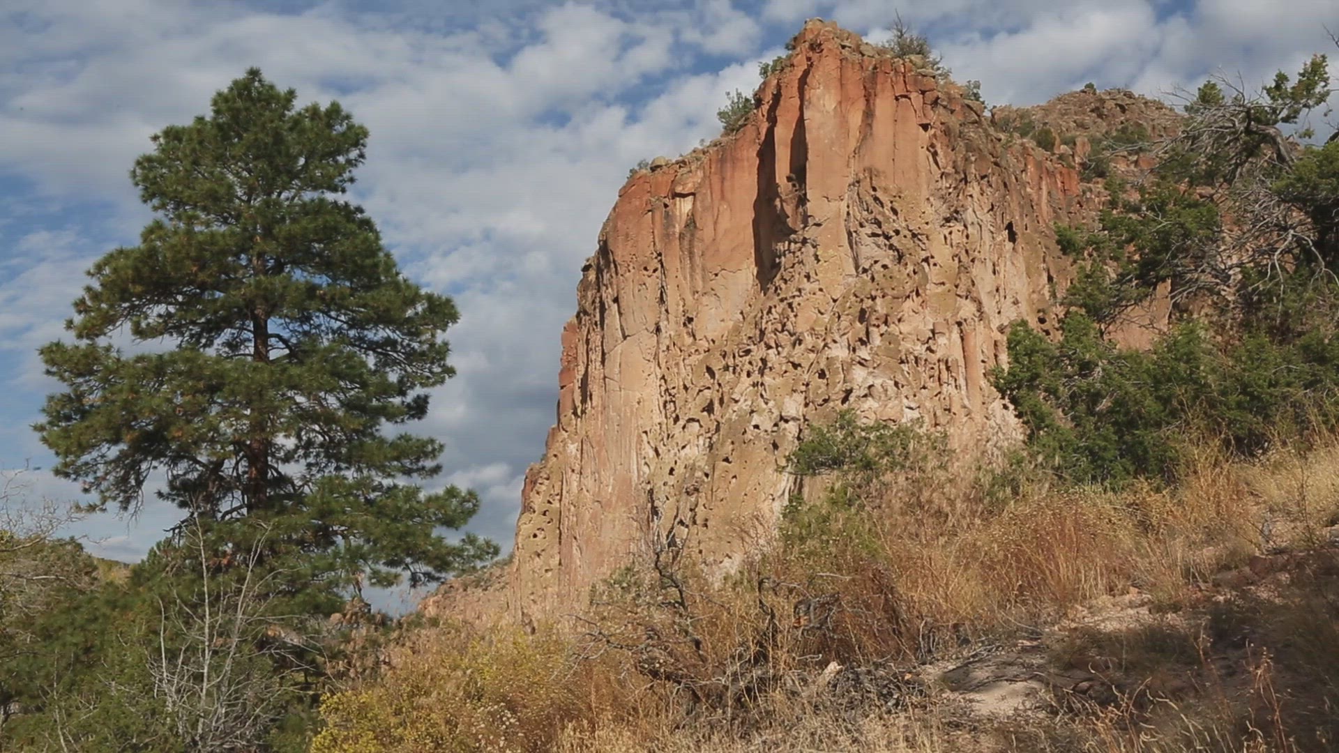 Puebloan ruins lining the Long House in Frijoles Canyon of Bandelier National Monument, New Mexico.
