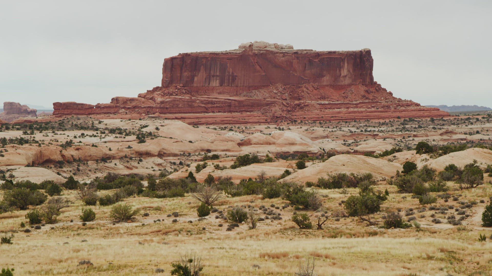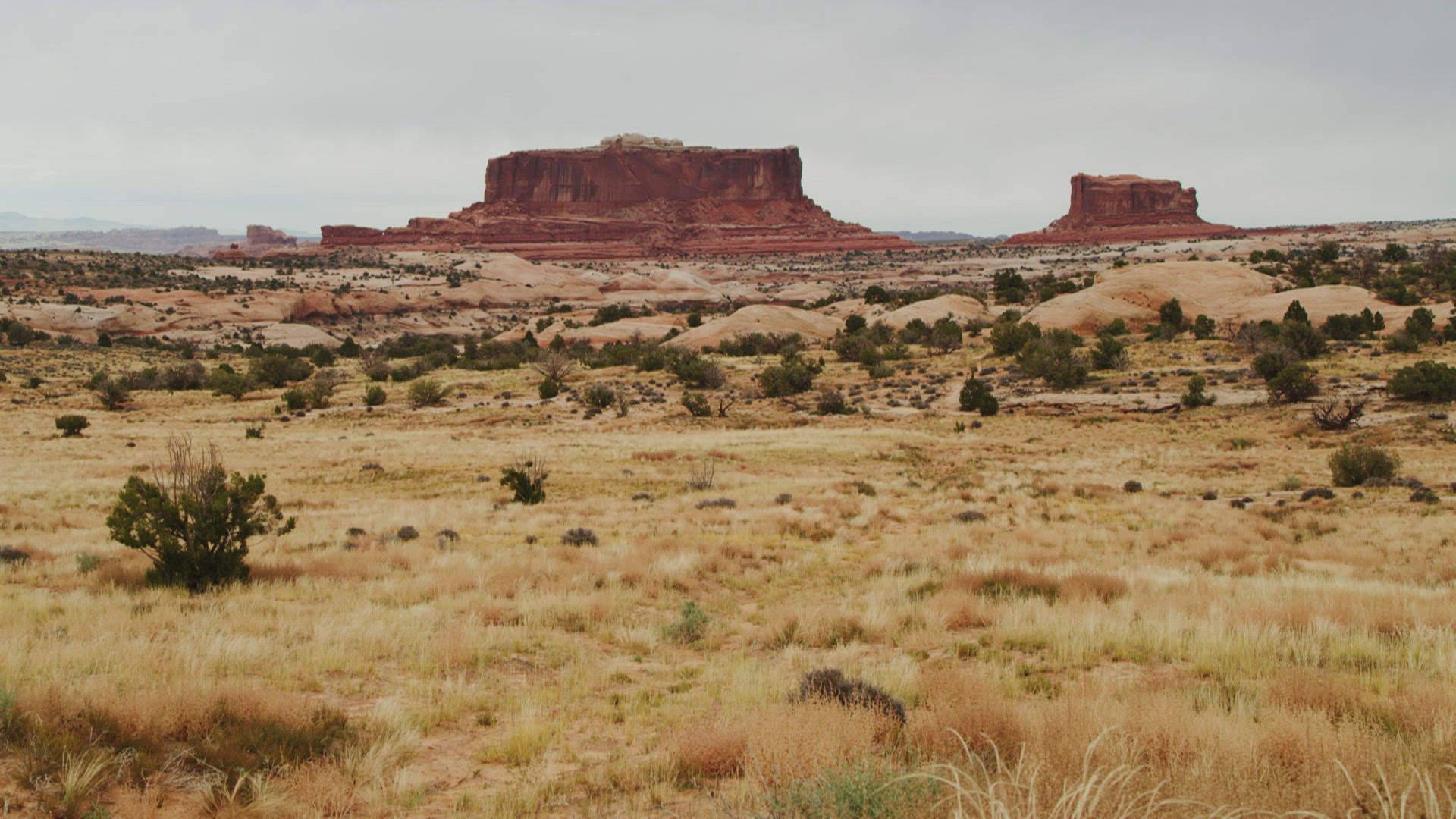 Sunset clouds hovering beyond sandstone cliffs and buttes near the Fisher Towers outside of Moab, Utah.